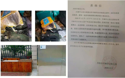 2020年12月1日下午,丹阳市保安服务有限公司驻吕城中心幼儿园保安李书耿同志在校园巡逻中,发现区域一脚有少量烟雾,走近查看,还有明显火光。凭借专业消防知识及经验,李书耿第一时间反应过来,是深井泵短路引起的自燃。李书耿果断切断电源,迅速就近取灭火器进行灭火。因及时发现并得当处置,避免了一场重大事故的发生,使集体财产免遭损失。