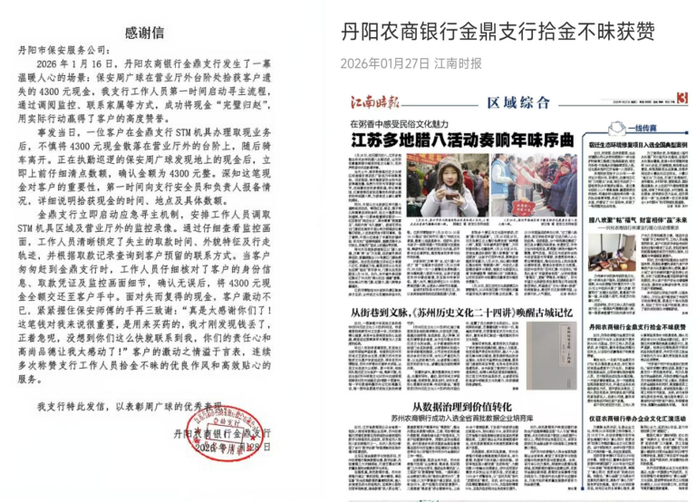 拾金不昧显担当 暖心服务获赞誉发布时间:2026-01-29 点击:44近日,丹阳市保安服务有限公司驻丹阳农商银行金鼎支行的保安员周广球,用一次拾金不昧的行动,生动诠释了“丹阳保安”的责任与担当。